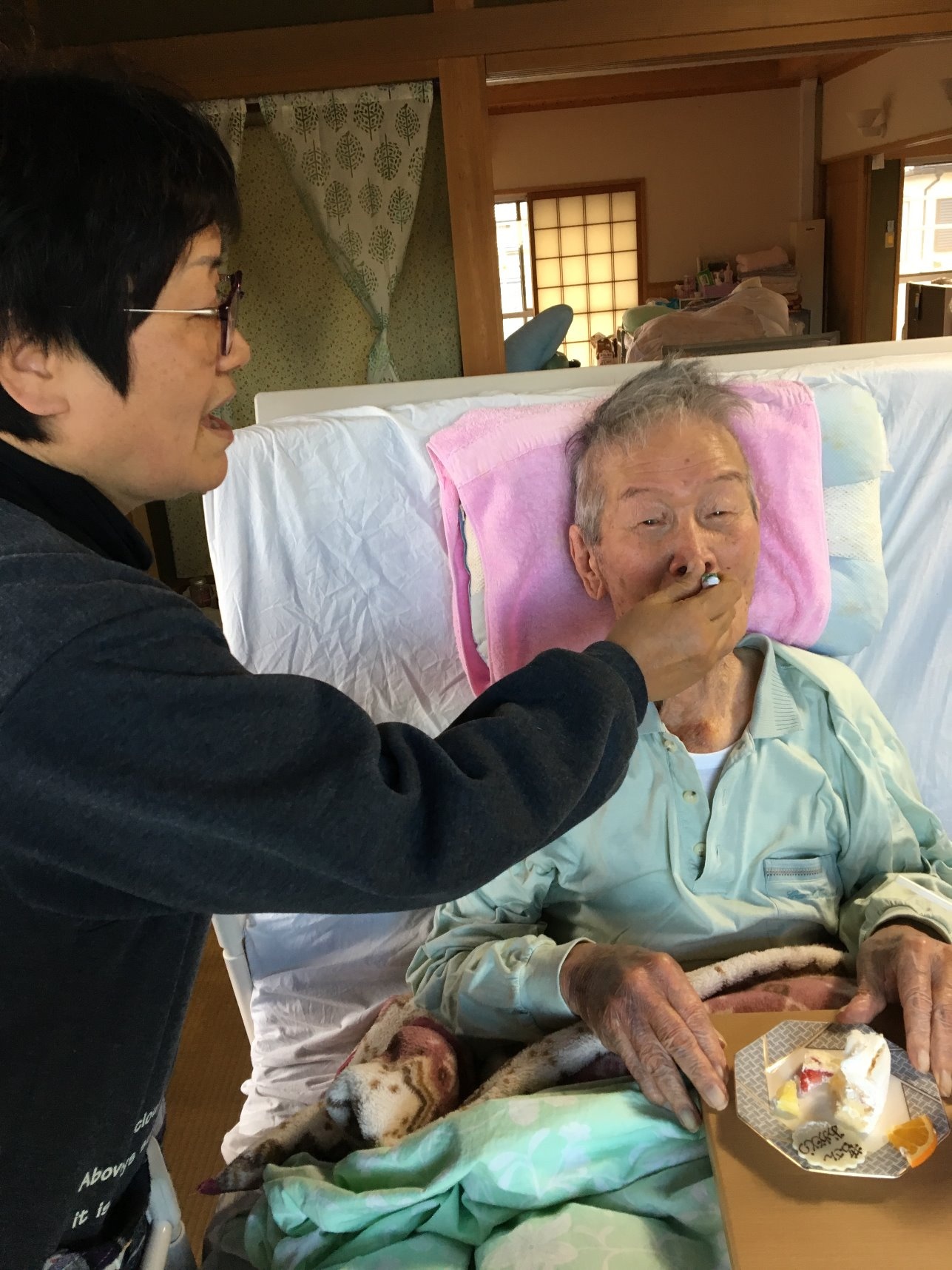 2018年12月10日(月) ほほ笑の森だより < お知らせ お誕生日おめでとうございます♪ 91歳の、お誕生日おめでとうございます(*'ω'*) ご家族様が、お祝いしてくださいました! とても幸せな一日だったと、おっしゃってました^-^ 良い1年になりますように。 娘さんに食べさせてもらえて、幸せそうですね♪